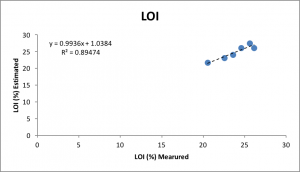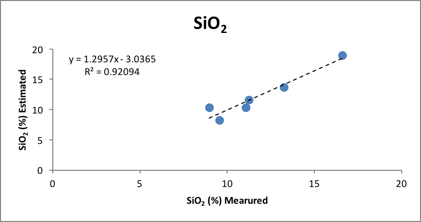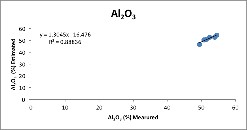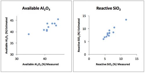| 图1. 实验室测量的可用氧化铝和活性二氧化硅的含量与便携式XRD定量分析仪所估算的含量高度吻合。 |