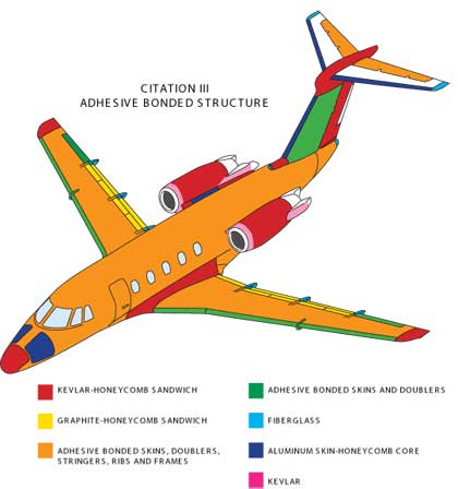The wide range of materials and configurations used in multilayered structures and the need for nondestructive evaluation of bonds has resulted in a great variety of testing equipment and methods. Ultrasonic and acoustic test methods have been quite successful. However, no single inspection method has been found adequate for the wide variety of applications seen today. The Cessna Citation III aircraft, for example, is constructed almost entirely from composites. This single airplane contains many types of bonded material, as shown in Figure 1.