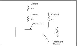 The loading of the receive element at the bottom of the cone is affected by the stiffness of the sample, which changes from very high to low, from bonded to disbonded regions. The spring model developed by P. Cawley (see Figure 16) describes the impedance as measured at the top of the spring., The spring stiffness over a disbond is the contact stiffness of the probe in relation to the defect stiffness. Over a well-bonded composite, the spring stiffness is only the contact stiffness. Since the measurements comprise a comparison of stiffness, results are better over stiff structures, because more flexible composite structures have less change from bond to disbond. The defect stiffness is dependent on the size and thickness of the disbond. As the impedance varies with the frequency, the proper test frequency is critical to obtaining good results.