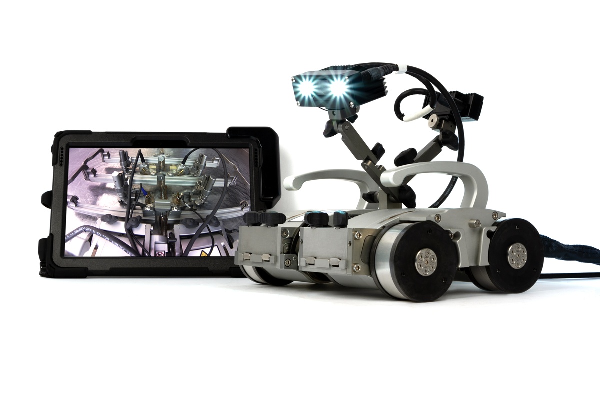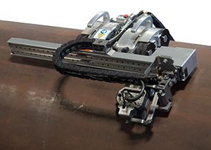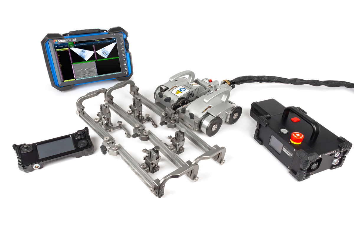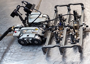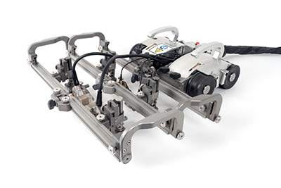 SteerROVER扫查器可添加双摄像头RECON套件,以协助进行远距离操控、保持焊缝充分居中以及帮助确保探头与表面保持接触。 | 在对纵向焊缝进行检测时,可以使SteerROVER扫查器和探头架支架呈弯折状态。 | SteerROVER扫查器在装配了电动光栅臂时,就变身为一种可以远程方式检测腐蚀情况的性能强大的解决方案。 |