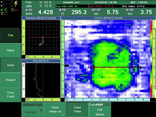 The technique was also tested on pipes with dents. Again, the dented area was scanned with the eddy current probe, and the resulting C-scan is shown below (Figure 3). The zone where the permeability changes is represented by the green color (higher voltage), and the permeability of the undamaged pipe is represented in white and blue (low voltage). Special attention is required to keep the probe in contact with the damaged surface of the pipe.