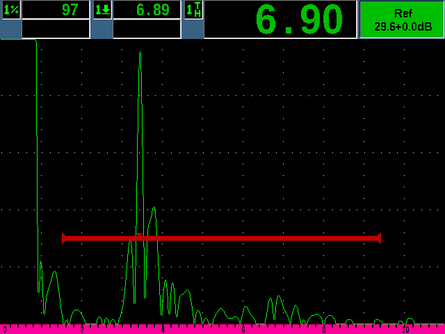 下面的示例表明使用一台EPOCH 600探伤仪和一个V110-RM探头(5 MHz)在20毫米厚的模塑框中探测到了一个大空隙。探头被耦合到工件的顶部。在合格工件中,声波传播到底面,并在20毫米的深度处生成一个回波。这个回波就是第一个图下面的波形视图中右侧的波峰。但是如果存在空隙,声波就会从空隙处反射,并会在屏幕上由红色闸门标注的区域中生成一个波峰,闸门代表工件的内部区域。在闸门区域中出现了信号回波,表明工件中存在着不连续性。在工件每个点上进行的检测只需要几秒钟的时间。